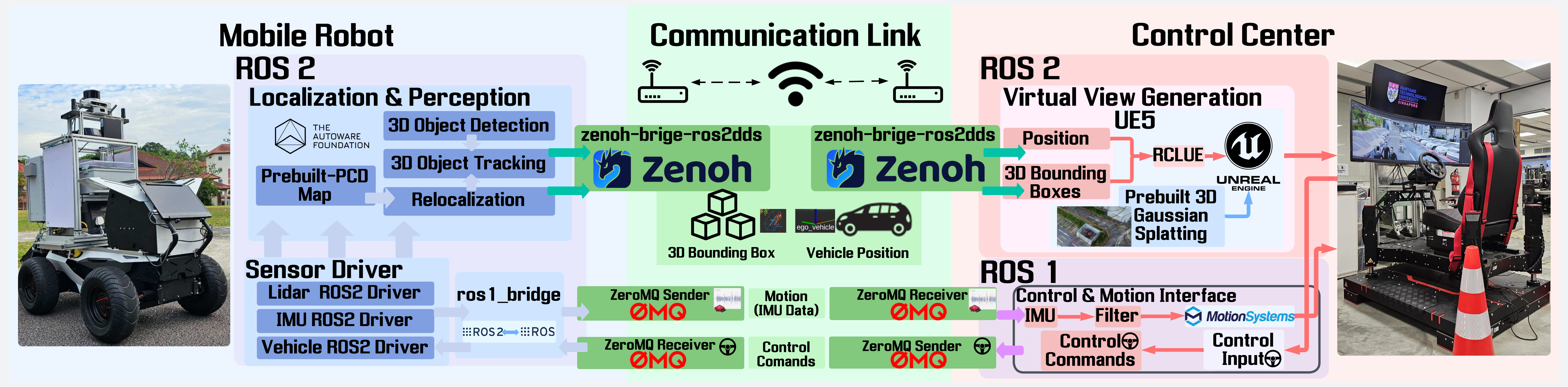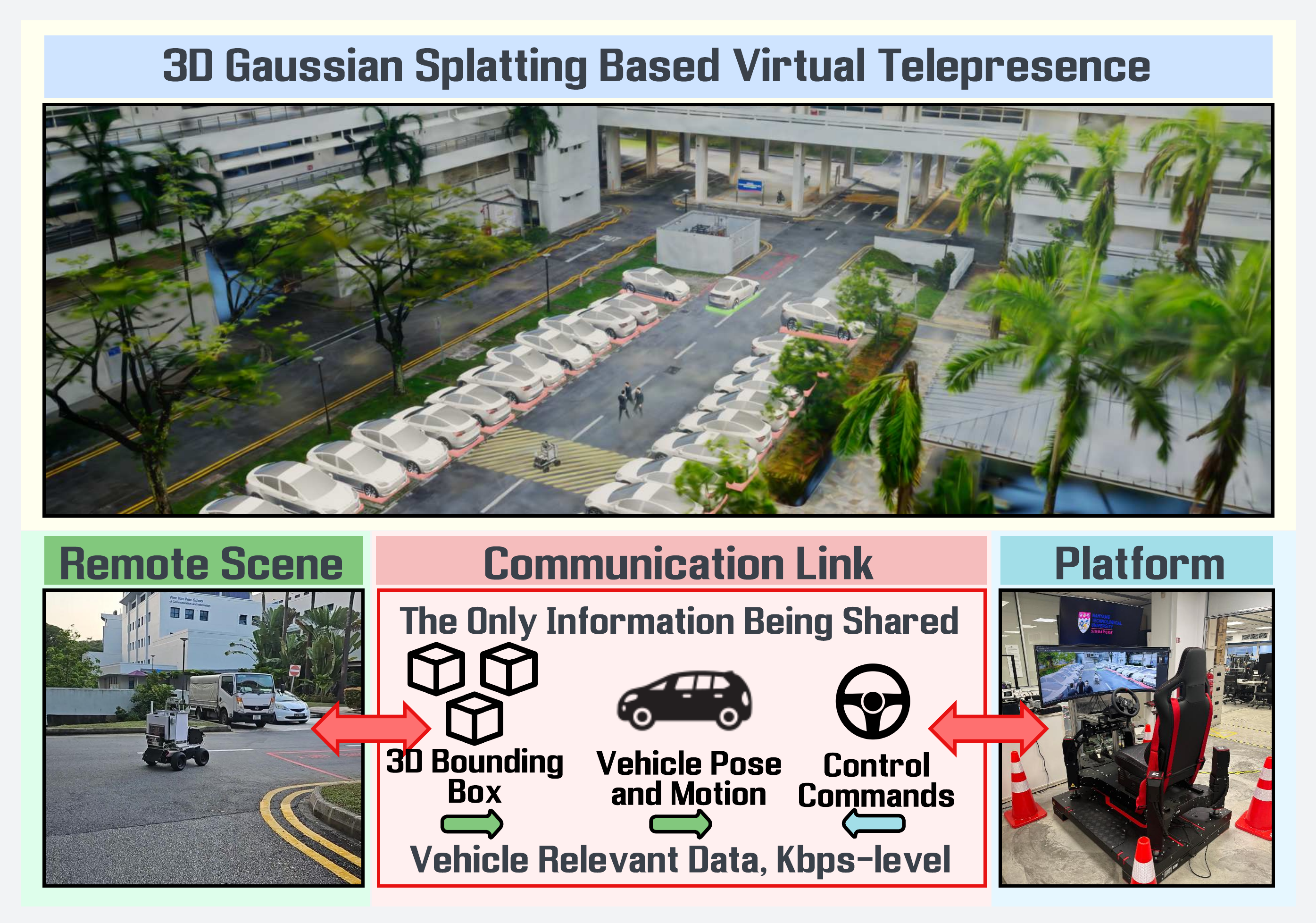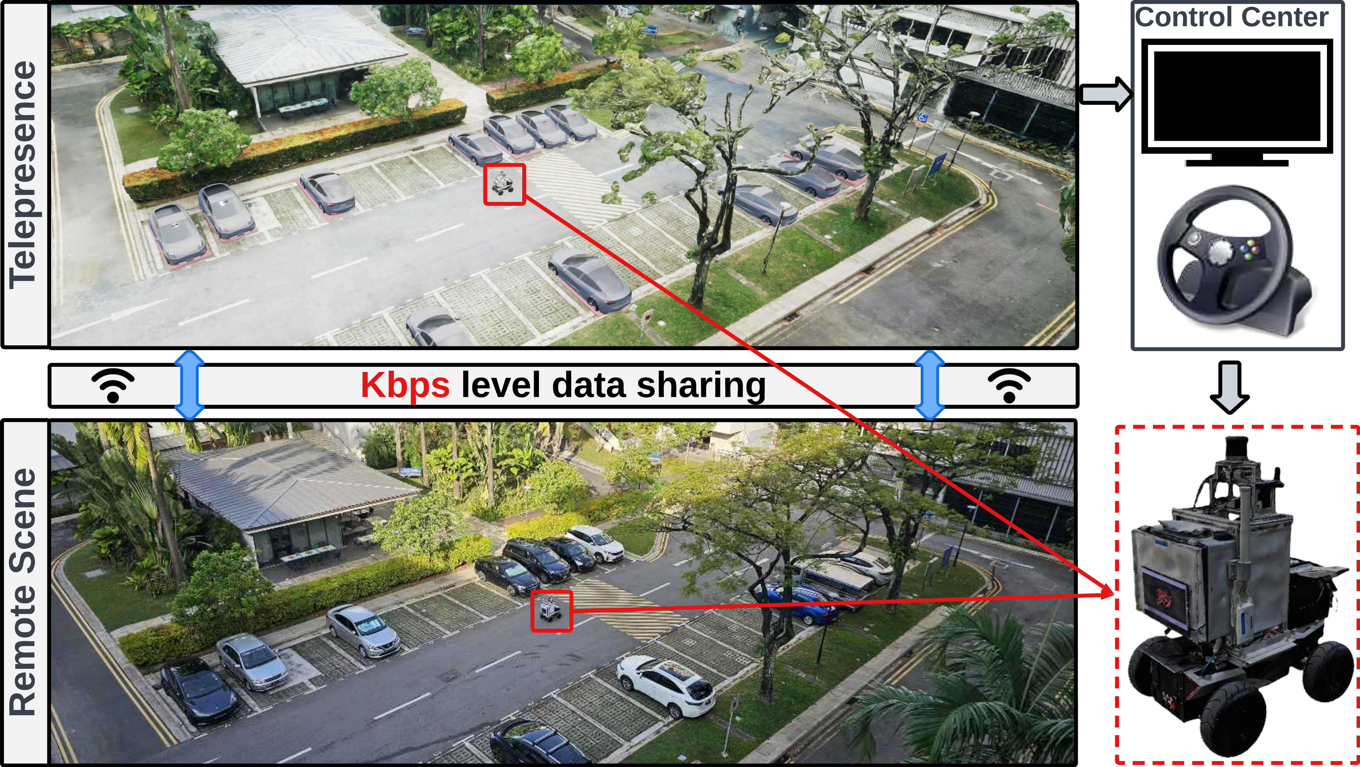 A digital twin teleoperation paradigm: pre-build the remote scene as a high-fidelity 3D twin, transmit only robot pose and dynamic obstacles at ~500 Kbps, enabling photorealistic 360° free viewpoints and day/night operation.